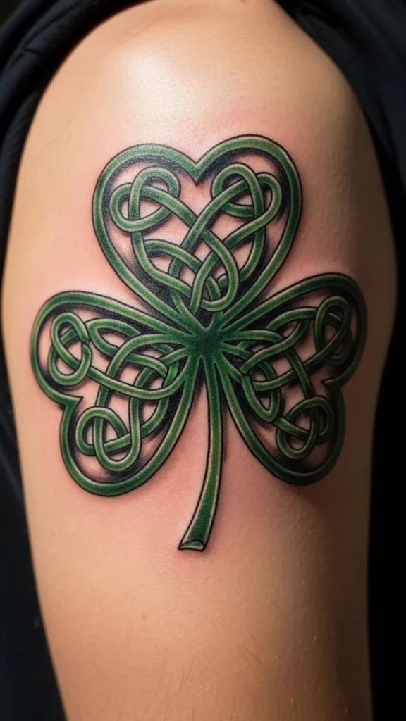 A shamrock made from knotwork blends two Irish icons into one design. It’s symbolic and stylish without being too intense. The loops give the clover a unique texture.