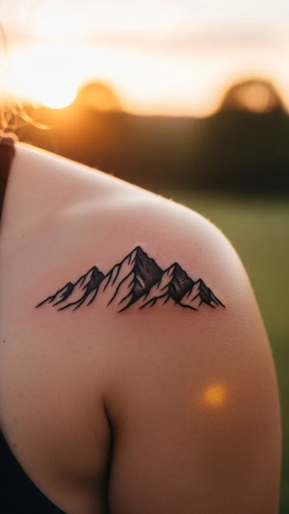 Sketch a quick mountain outline on paper and tape it to your shoulder to test size. You can add one tiny shamrock at the base or keep it clean. This tattoo suits the shoulder blade, calf, or forearm. Keep the lines bold to maintain clarity. During healing, avoid backpacks or straps that could rub the area.