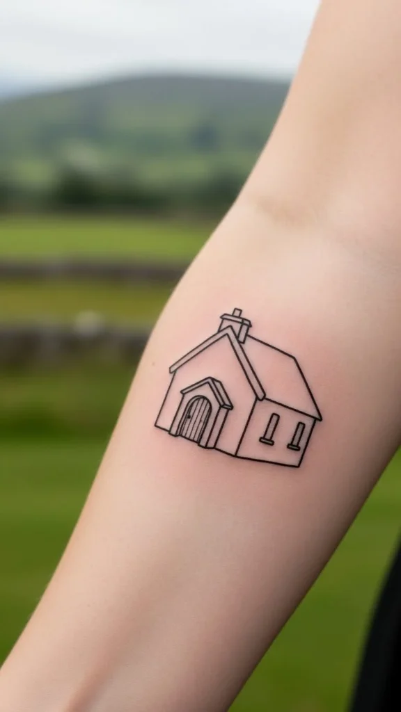 Try sketching a box and triangle roof on paper to create your version. You can place a small shamrock above the doorway if you want symbolism. This tattoo sits nicely on the forearm, ankle, or ribcage. Keep the lines clean so the cottage reads clearly. Avoid tight sleeves during healing.
