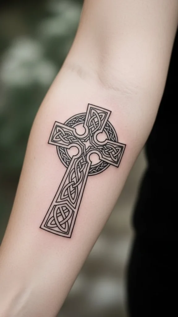 This design works well mid-forearm or at the top of the shoulder. To save money, skip the complicated knotwork and stick to a clean silhouette. You can sketch a cross at home using ruled paper to see the proportions. If you want a softer look, your artist can round the edges or add a gentle glow effect with dotwork. Wear loose clothing during healing to prevent rubbing.