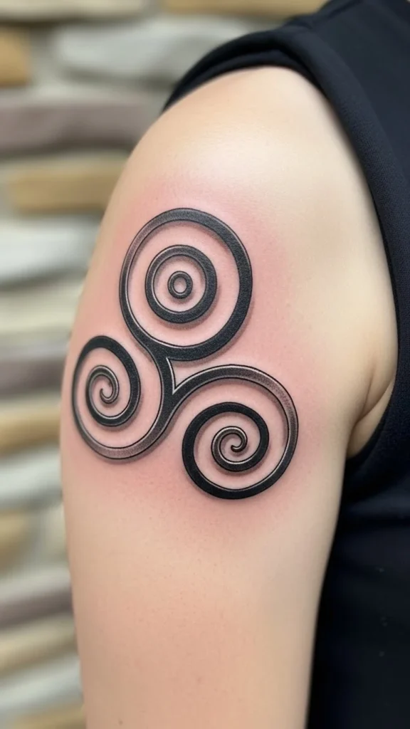 The triskelion combines three spirals that meet in the center. People often choose it to represent progress or balance. The design has motion to it, which makes it visually interesting without needing extra detail.