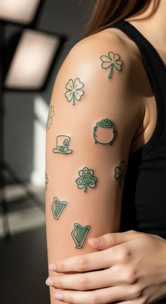The inner forearm is ideal for symbols that tell a small story. Think of a clover cluster, a Celtic arrow, or a tiny charm line. This area gives good visibility, so choose something you’ll enjoy seeing often. If you’re mindful of cost, pick a small symbol or simple outline. You can preview the layout by placing temporary tattoos along your arm to compare spacing. This spot works well whether you want a horizontal or vertical design.