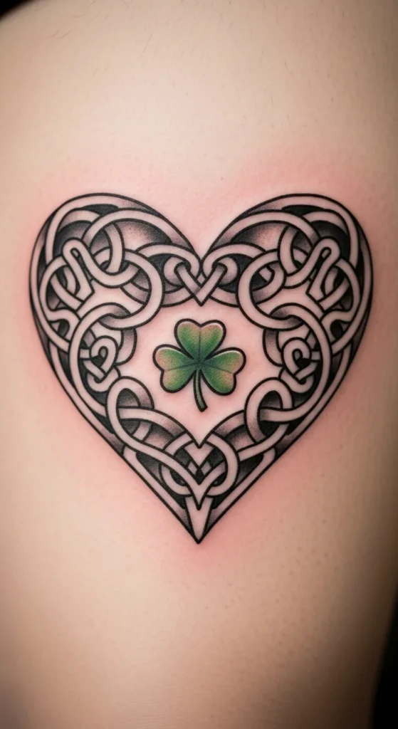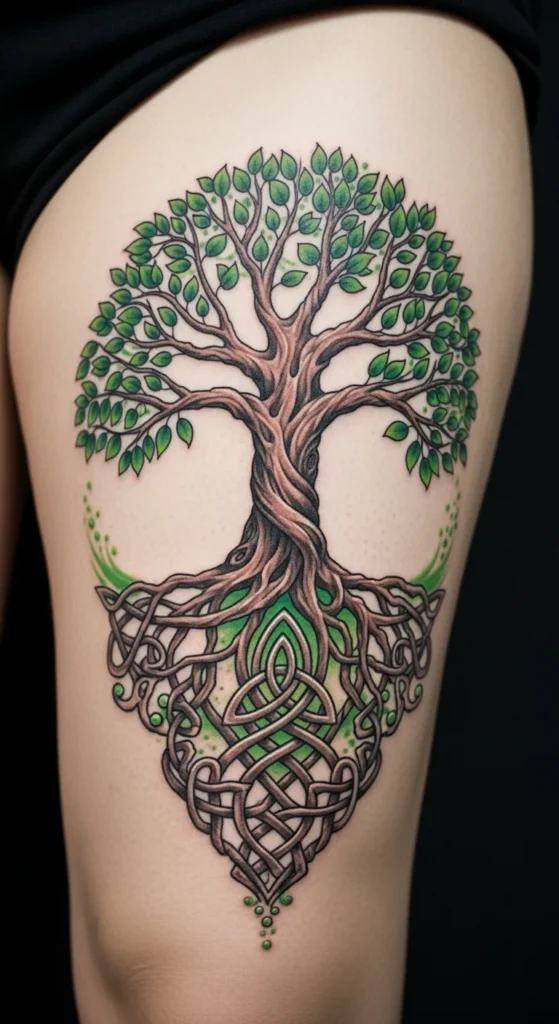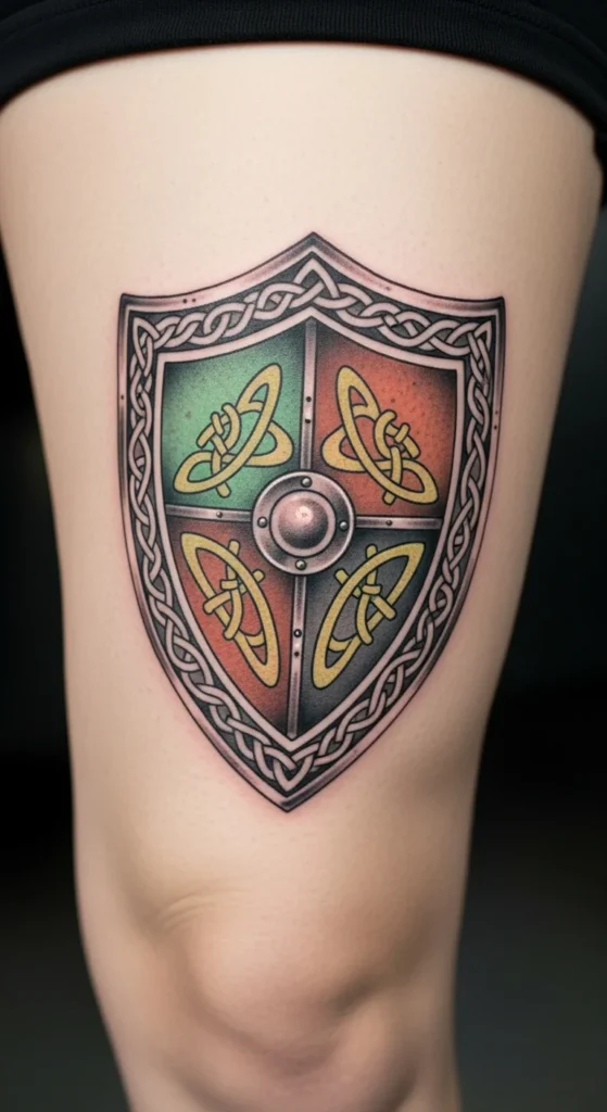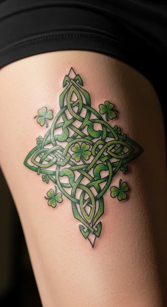 A Celtic shield feels bold without being overwhelming. It sits nicely on the upper thigh where there’s enough space for clean symmetry. You can choose a simple shield outline to manage cost or add light dot shading for texture. The green highlights help tie it to St Patrick’s Day without overpowering the design. Hold a paper shield shape against your thigh to test angles. This style blends easily with other Celtic pieces.