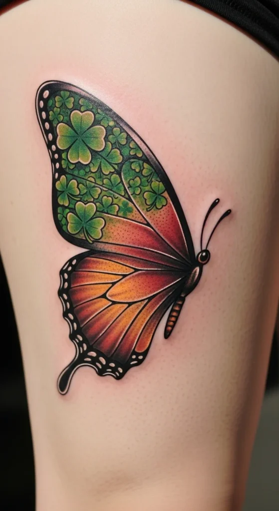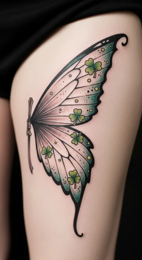 A butterfly with shamrock-shaped wings mixes nature with subtle Irish themes. The curves of the thighs help the wings look full and smooth. You can make this as simple or detailed as you want. A line-art version keeps it budget-friendly, while a shaded green design adds more depth. For DIY planning, fold a piece of paper and cut out matching wing shapes to preview symmetry. The butterfly sits nicely on the outer thigh since it gives the wings room to expand. It’s a gentle but expressive option that photographs beautifully.