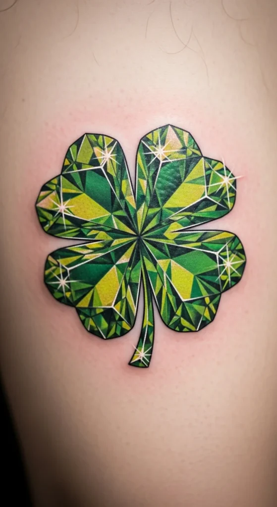 This style suits anyone who likes shiny, jewel-like designs. The gem technique creates the illusion of reflection without requiring large blocks of color. That keeps the tattoo comfortable and easier on your budget. If you prefer a smaller look, scale the clover down and keep the highlights minimal. For testing placement, print a clover outline and color it lightly with gel pens so you can mimic the gem texture. This tattoo works well on the upper thigh because the flatter surface helps keep the symmetry balanced.