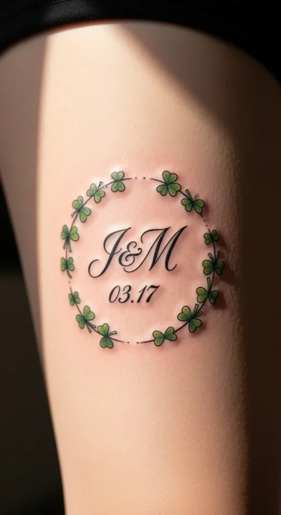 This idea keeps things personal without feeling overwhelming. The shamrock ring can be as thin or full as you like. A simple version uses small outlines placed close together, which saves time. You can sketch the circle at home using a cup or lid as a guide. The inner detail—like a date or initials—can stay tiny while the shamrocks add shape and balance. This works well on the inner thigh for a more private placement.
