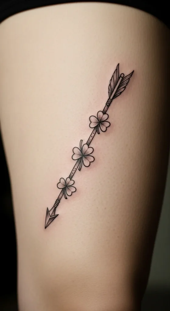 A shamrock arrow brings a directional look that draws the eye upward. It’s simple, clean, and great for anyone who prefers straight-line tattoos. A minimalist arrow keeps time and cost down. You can try drawing one directly on your thigh with eyeliner to check alignment. Add small shamrocks along the arrow for a seasonal touch that still works year-round. It looks especially good on the side of the thigh where the leg’s curve helps it appear longer.