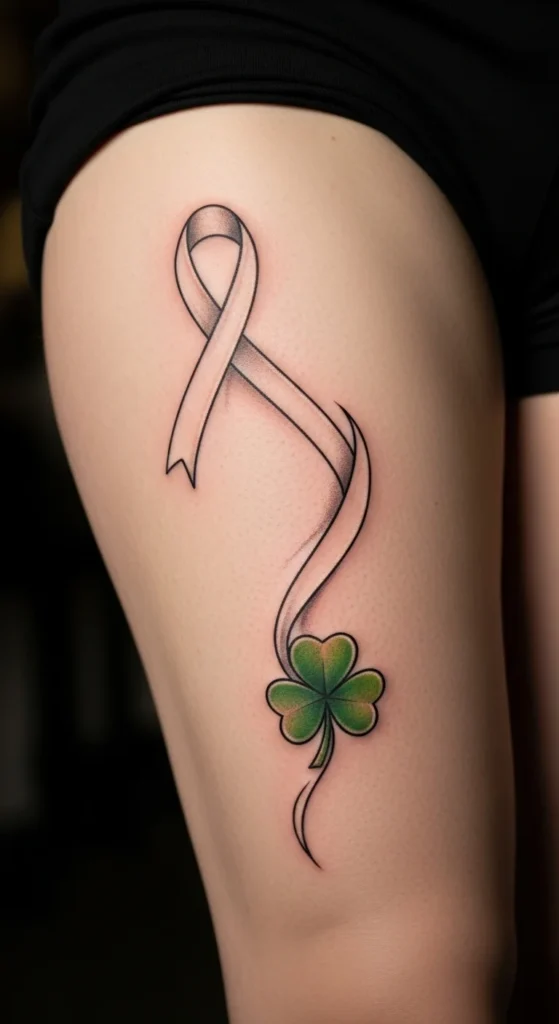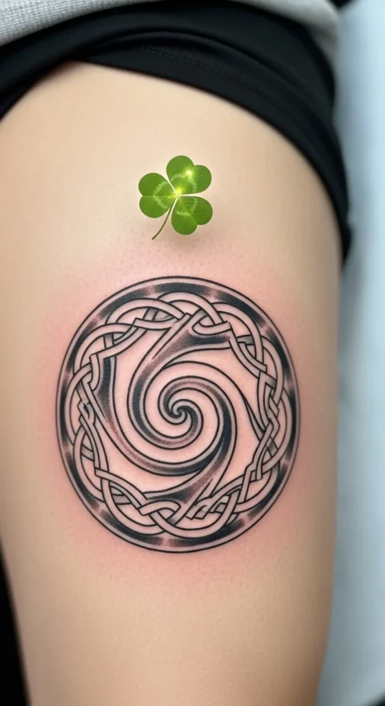 This option keeps the design simple but symbolic. The spiral has smooth motion that pairs well with thigh shape. Add a tiny clover above or beside it for an Irish touch. Because spirals don’t require heavy detail, they help manage cost. For planning, draw spirals in different sizes on paper and place them over your thigh to see which one feels balanced. The look stays minimal yet expressive.