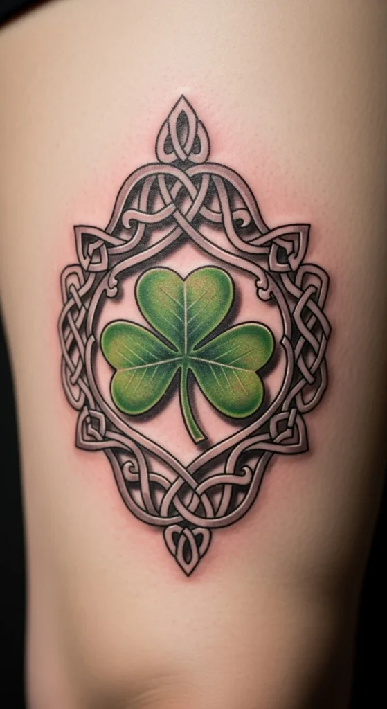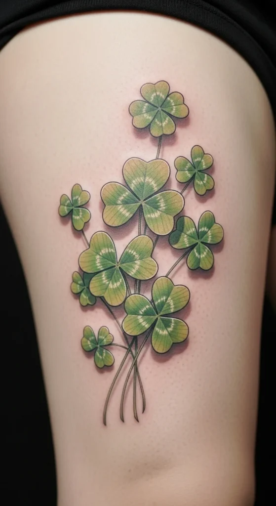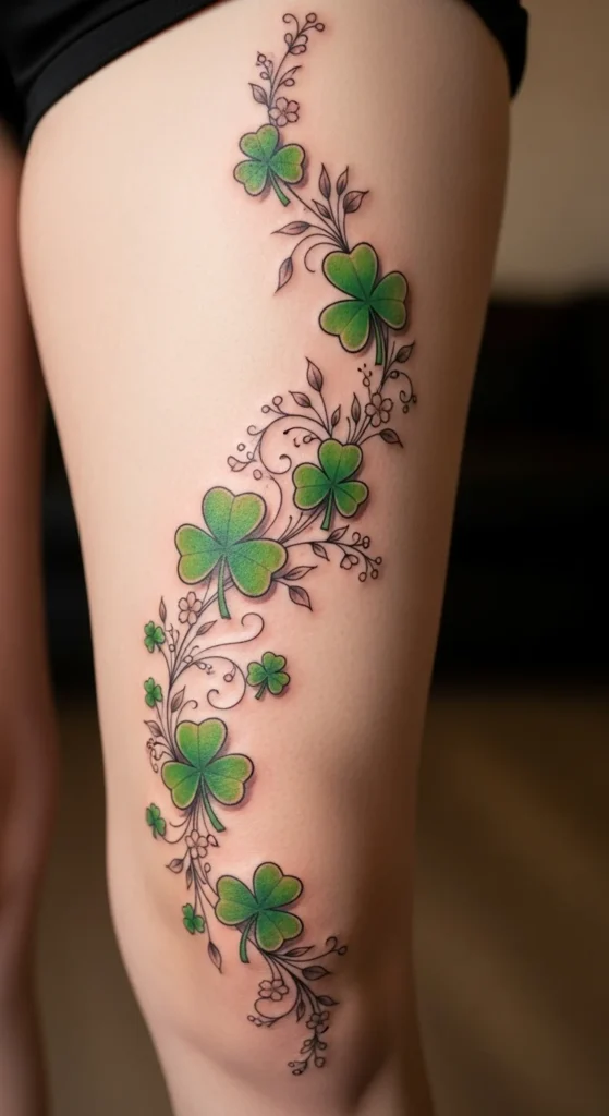 A minimal shamrock outline is perfect for first-timers or anyone who prefers subtle designs. The outer thigh offers a low-pain placement with plenty of room if you ever want to enlarge it later. One simple way to save money is choosing a single-line design instead of a shaded one. It heals quickly and usually requires only one session. If you’re unsure about sizing, try drawing small shamrocks on your thigh with temporary ink until one feels right. This design is easy to pair with other symbols like stars or small knots as your collection grows. The clean outline gives a balanced look without taking over your entire leg.