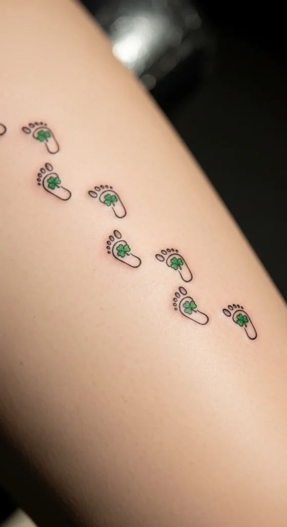 This playful option works well for people who enjoy symbolic or personal storytelling. Each footprint can represent a person, pet, or milestone. Adding a small shamrock inside each one ties it to the holiday theme. Keep costs down by choosing outlines rather than filled shapes. You can cut tiny footprints from paper to test spacing and direction. The trail angle can run up or across the thigh depending on your preference.