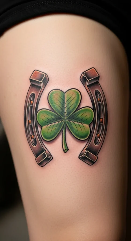 A good-luck badge blends classic Irish icons into one cohesive design. The horseshoe shape frames the shamrock, giving the tattoo a structured feel. To keep it affordable, skip heavy shading and request a cleaner, more graphic version. If you enjoy a slightly rustic look, add tiny dots around the border for texture. You can test placement by cutting out a simple paper horseshoe and holding it against your thigh. This design works well at a medium size because the shape stays recognizable even from a distance. It’s a great option if you want something positive, symbolic, and easy to customize.