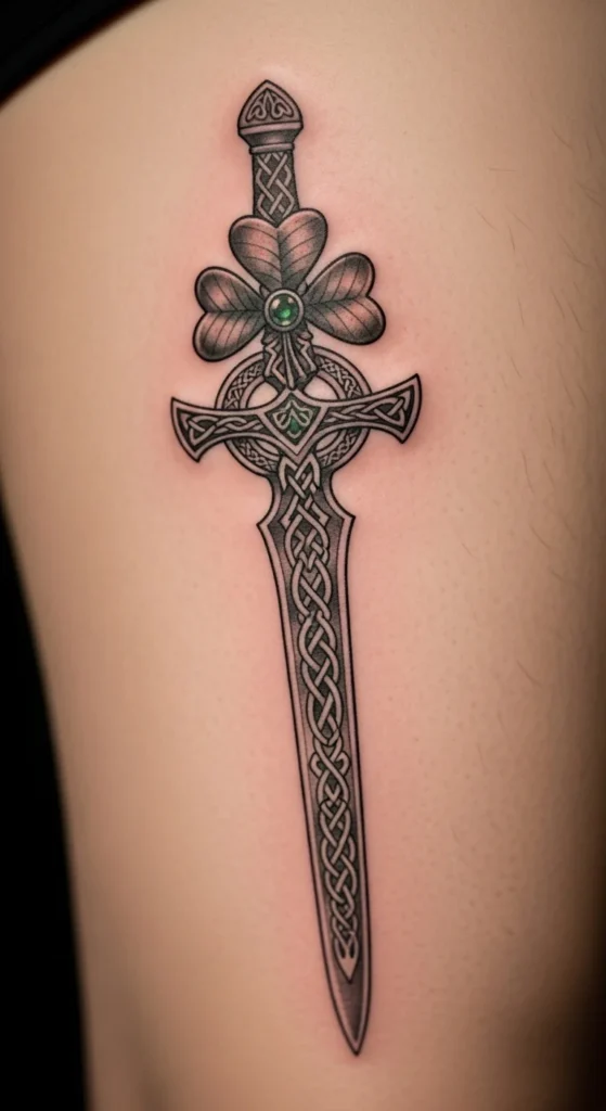 This idea suits anyone who likes strong symbolism. The sword shape runs nicely along the thigh’s vertical line, giving the leg a longer look. To keep the process simple, choose a fine-line approach instead of heavy metal textures. Adding the shamrock handle softens the design so it doesn’t feel too aggressive. This tattoo also lets you choose your story—strength, heritage, or personal transformation. For planning, draw a long straight line first to check how it flows with your leg shape. Then sketch the shamrock handle to scale. Many people choose this style because it pairs well with future additions such as knot borders or small dates.