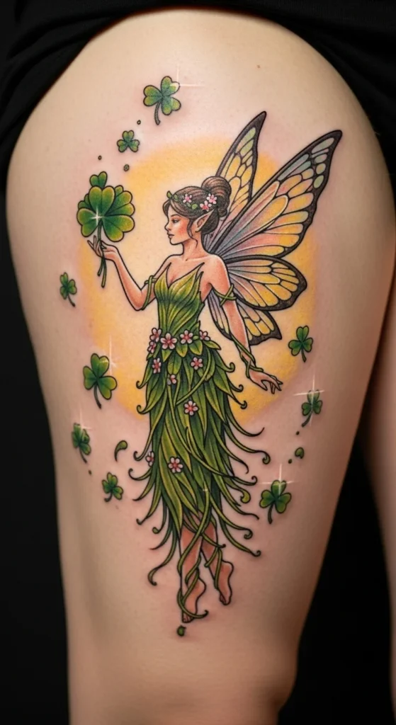 Fairy tattoos bring a playful feel while still honoring Irish folklore. You can keep them simple with light outlines or go all in with delicate wings and green accents. To keep the cost manageable, choose fewer decorative details and focus on clean lines. Try sketching the wings on your thigh with temporary ink to check proportion. This design often works best on the outer thigh where there’s enough room for the wings to spread without distortion. Many people add sparkles or tiny clover shapes for extra charm. The final look feels personal and artistic without overwhelming the leg.
