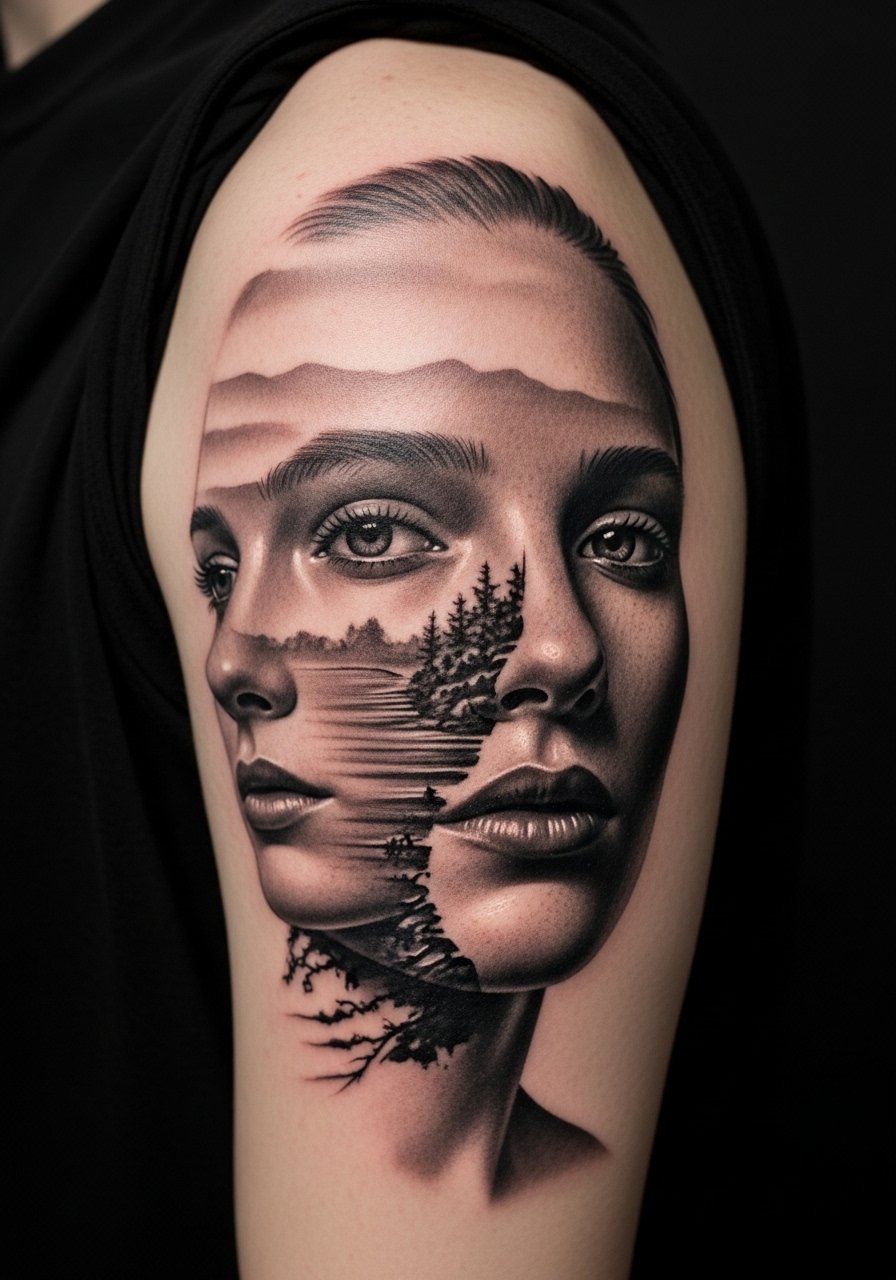 I love double-exposure tattoos for their cinematic, surreal impact. On the upper arm you get enough canvas for facial detail plus a second image—trees, galaxies, or waves—that seems to sit inside the portrait. Pain is low; the outer arm is forgiving. Expect layered shading to need precise aftercare—gentle cleansing and hydration keeps tonal work crisp. Over time, micro-shading softens; heavier contrast in the portrait areas helps it maintain form. A common mistake is asking for too many tiny highlights; they may fade. When consulting, ask to see healed double-exposure examples so you know how transitions hold up on lived skin.