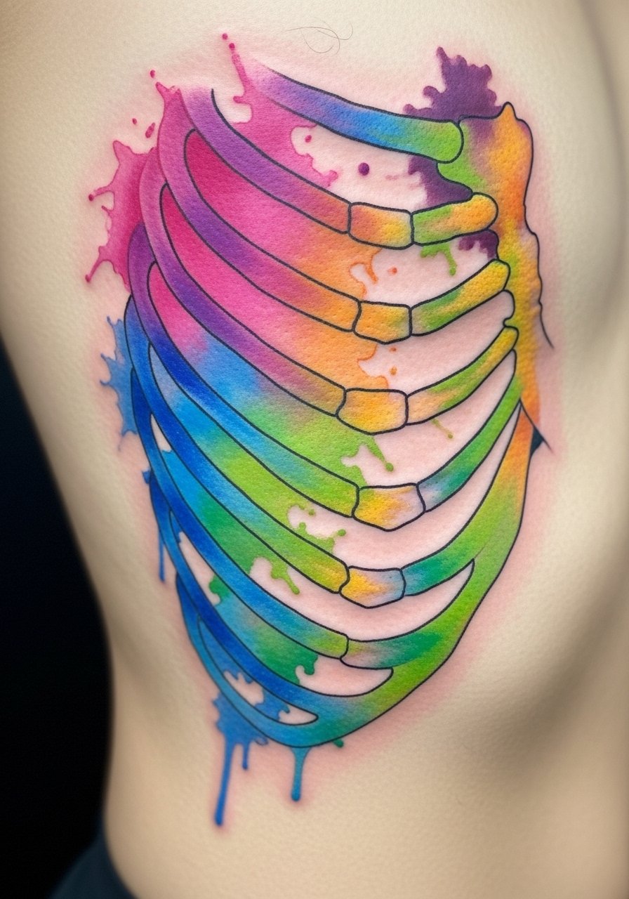 Ribcage blends are dreamlike because color pools feel like they’re breathing with your body. The ribs are painful—expect intense sessions and breaks. Healing needs careful movement management: avoid heavy stretching and sleep positions that press on the area. Vibrant watercolor areas can fade faster if not saturated well; in my experience, artists compensate with solid anchoring outlines or contrast. A common mistake is tiny watercolor patches without supporting structure—they spread into each other and lose definition once healed. Look for artists who specialize in color blending and healed-color photos on ribs.