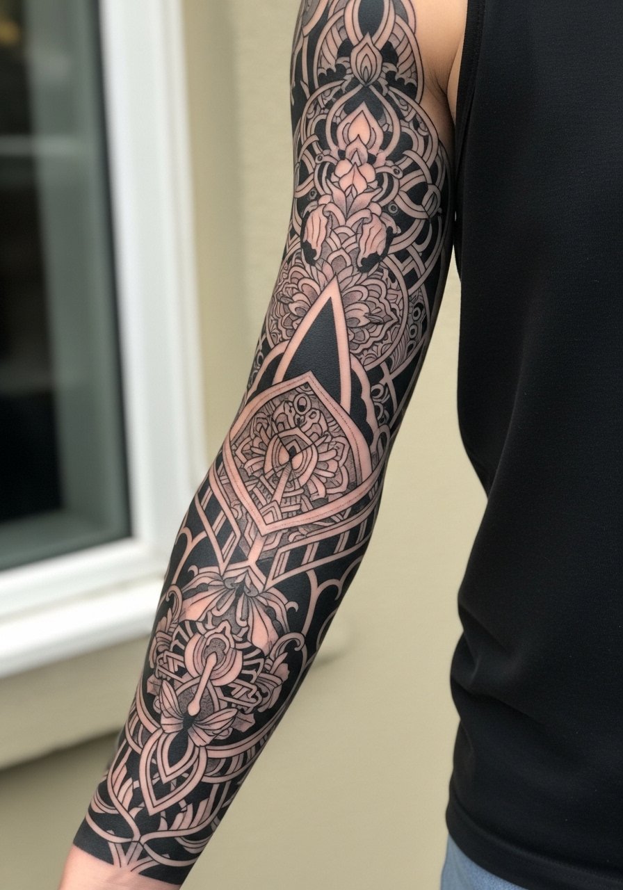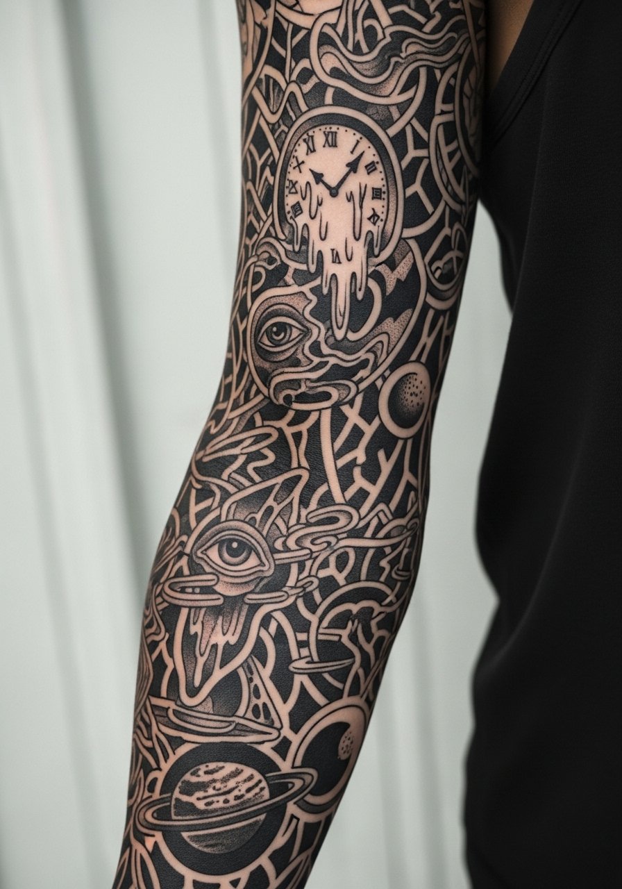 Blackwork thrives for surreal themes—bold shapes, repeating motifs, negative space creating floating elements. A sleeve lets the artist build a narrative around the arm. Pain is moderate across the outer arm but expect higher intensity near inner elbow and wrist. Black ink ages the best; thick fills keep the design readable years from now. Healing time spans weeks between sessions; heavy black areas take a while to settle. Don’t ask for tiny, overly intricate textures inside dense black fills—they won’t translate well when healed. Ask for artists who do strong contrast and clean fills; that skill keeps surreal patterns readable over time.