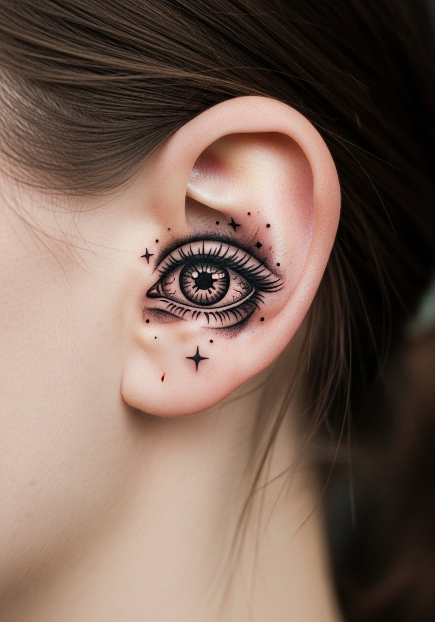 Behind the ear is a secret spot that reads intimate and oddly dreamlike. Small realistic eyes, moons, or whisper motifs look like a private signal. Pain is medium—thin skin and bone make this sharper than forearm work. Healed skin can lose crisp micro-details, so choose slightly bolder lines and soft shading rather than ultra-fine texture. Keep hair and ointment off the area during the first days to avoid clogging. Artists who do piercing-like placements and small micro-realism will deliver the clean finish this spot needs.