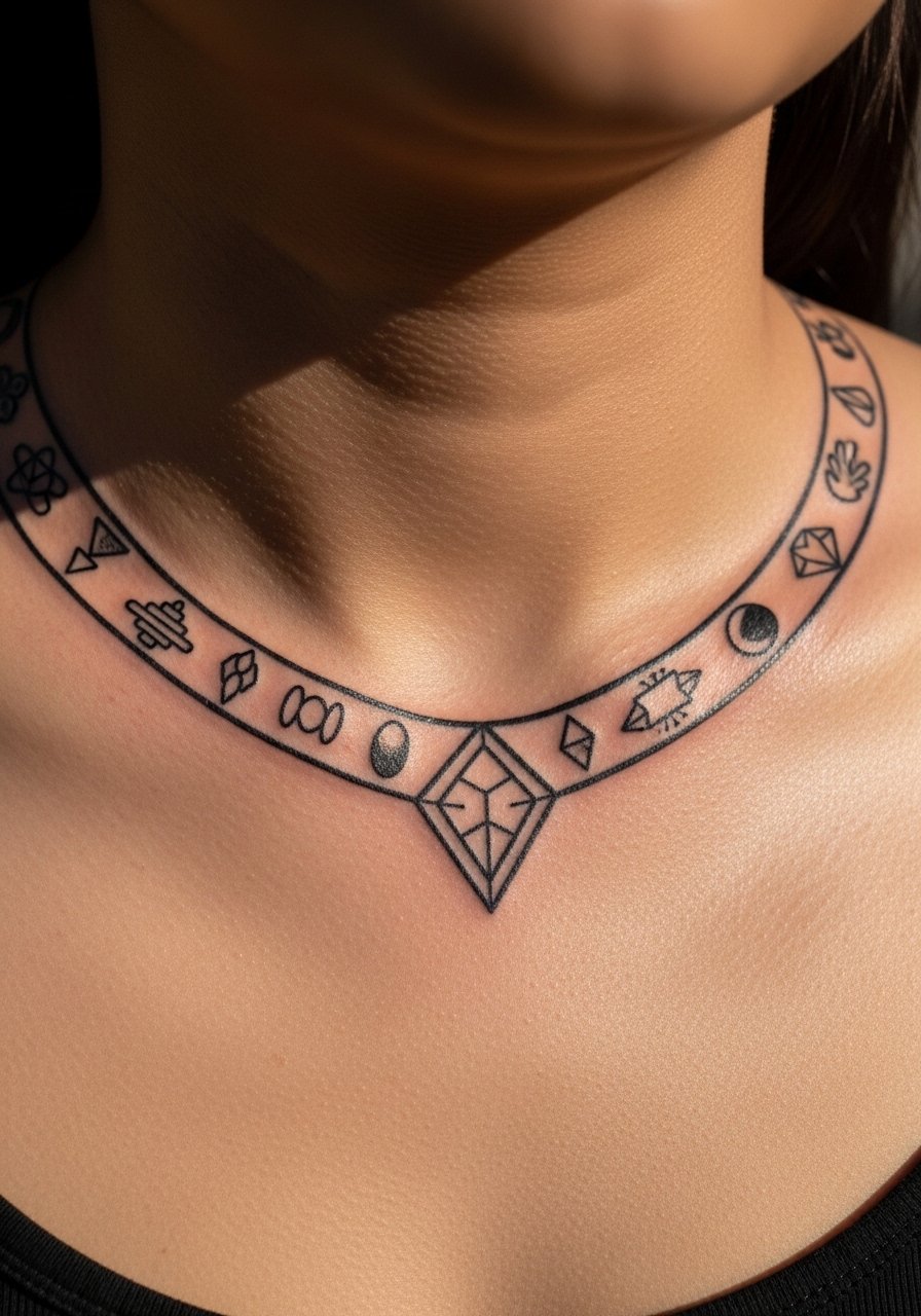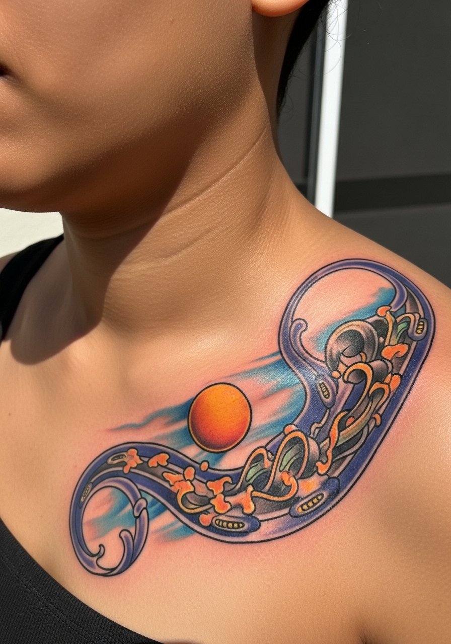 Collarbones frame surreal necklaces and bands that peek from shirts—floating geometry, eye motifs, and dripping shapes work well here. Expect sharp pain around the bone and longer healing if the band crosses the joint. Because it’s highly visible, aim for boldness: thin chains of detail won't last as crisply. I’ve seen artists recommend clean black anchors plus small color touches for staying power. Keep sunscreen in your long-term maintenance to maintain contrast; the collarbone is often exposed and UV accelerates fading.