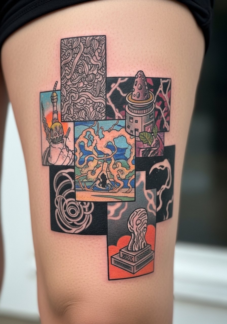 The thigh is perfect for a collage approach—stacked surreal vignettes that together tell a dream narrative. Low pain and ample surface mean you can experiment across sessions. Healed pieces keep definition well; colors hold better here than on hands or feet. Be careful mixing extremely different styles without clear separators; they can visually fight once healed. I’ve seen artists use thin negative-space bands to separate motifs and keep the overall piece legible over time.