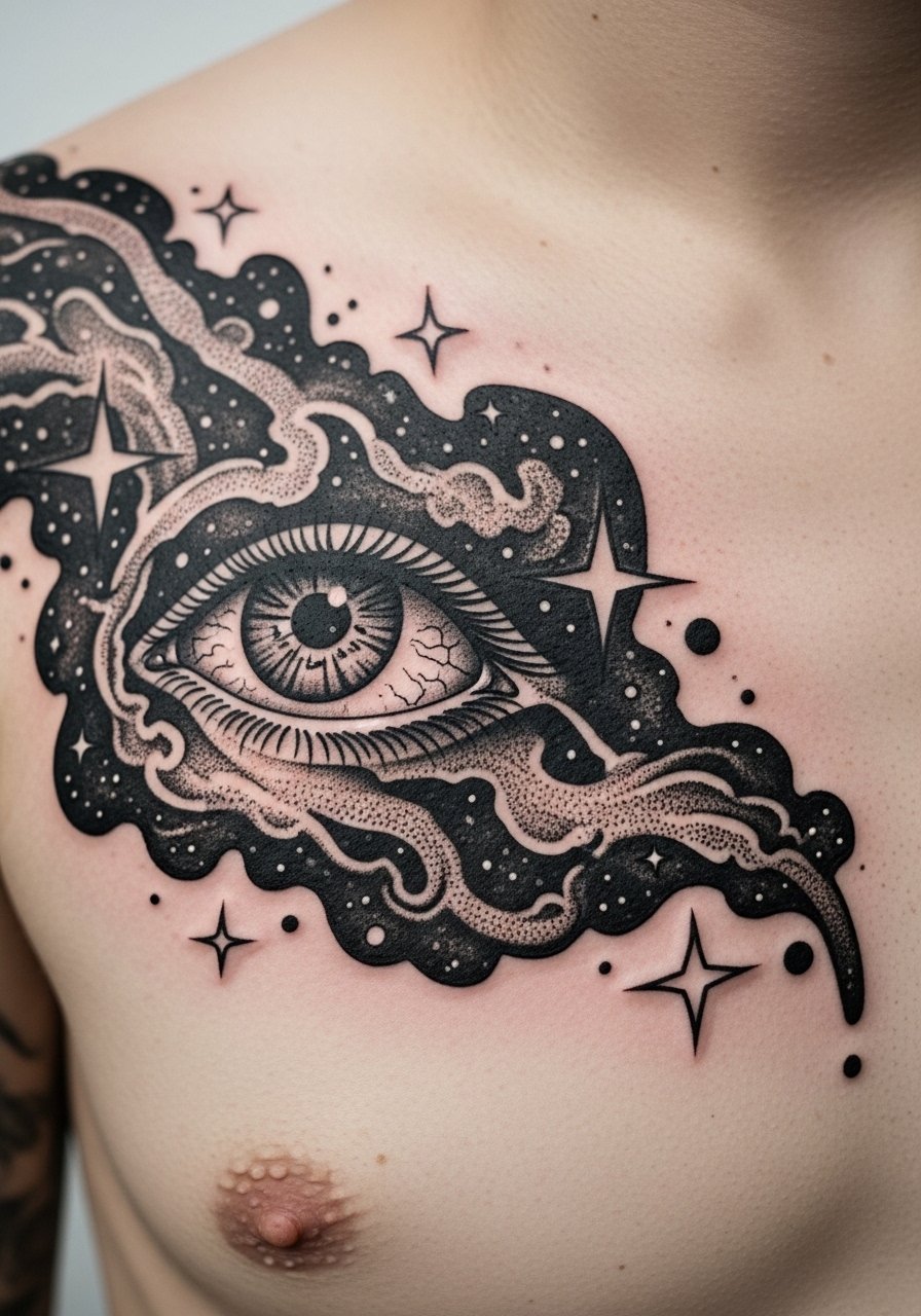 A chest eye with cosmic elements reads like a dream center. The chest can be painful near bone and sternum; expect an intense session. Heavy blacks and dotwork hold well when healed; dot gradients soften but retain texture. Watch for movement across the chest—ask the artist to preview the design with you standing and taking a breath so proportions remain balanced. Keep bandages loose the first night to avoid pressure. Artists who do sacred-geometry dotwork will make this feel otherworldly without losing clarity.