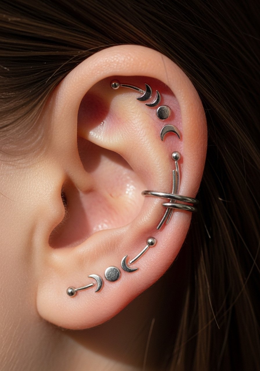 Ear tattoos hug cartilage and look like living jewelry. Small surreal crescents or tiny faces can be very effective. Cartilage is sharp to tattoo—expect higher pain and longer healing. Tiny lines tend to slightly blur; ask for compact, slightly thicker key lines. Avoid over-detail; the ear contours will alter how the design reads when you move your head. Artists experienced in ear placements understand how to size work to last.