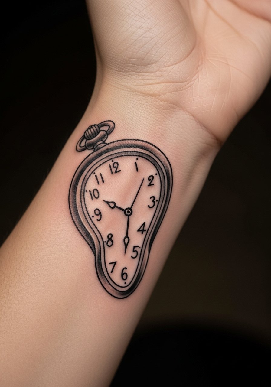The wrist reads personal and intimate—surreal pockets watches, clocks, or warped time motifs feel like a wearable thought. Pain is moderate; thin skin and bone make this sting a bit. Healed lines can blur with constant movement, so ask for slightly bolder outlines and simple shading to retain the essence. Daily application of sunscreen once healed will help maintain contrast, as wrists are often exposed.