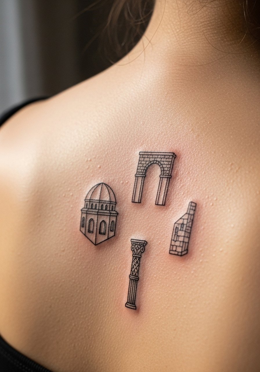 Upper back tattoos give designers room for architectural surrealism—tiny floating houses, bridges that don’t connect. This area tolerates detail well and ages predictably. Pain is moderate; avoid the spine area if you want less discomfort. Artists often pair crisp architecture lines with dotwork skies; that combo reads beautifully even after several years. Keep tops loose while healing and moisturize to prevent scabby texture in the lines.