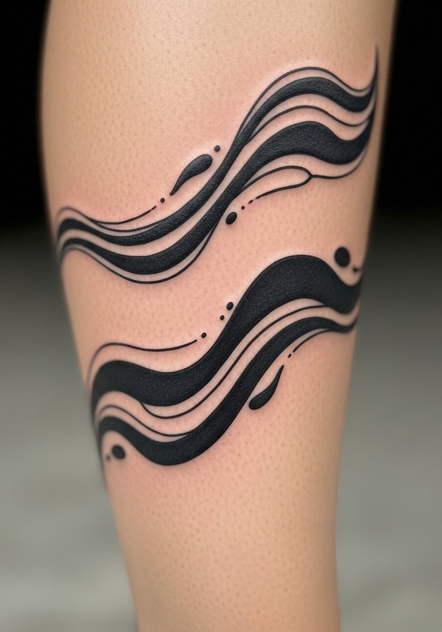 A calf band that uses negative space to suggest movement feels trippy in motion—think floating ribbons or ribbons turning into birds. Calf tissue holds ink well; shading ages attractively. The band format helps anchor the composition so motion doesn’t ruin the visual. Avoid micro-line detail near the back of the leg where wear can blur thin strokes. Ask for bold anchors to maintain shape as you move.