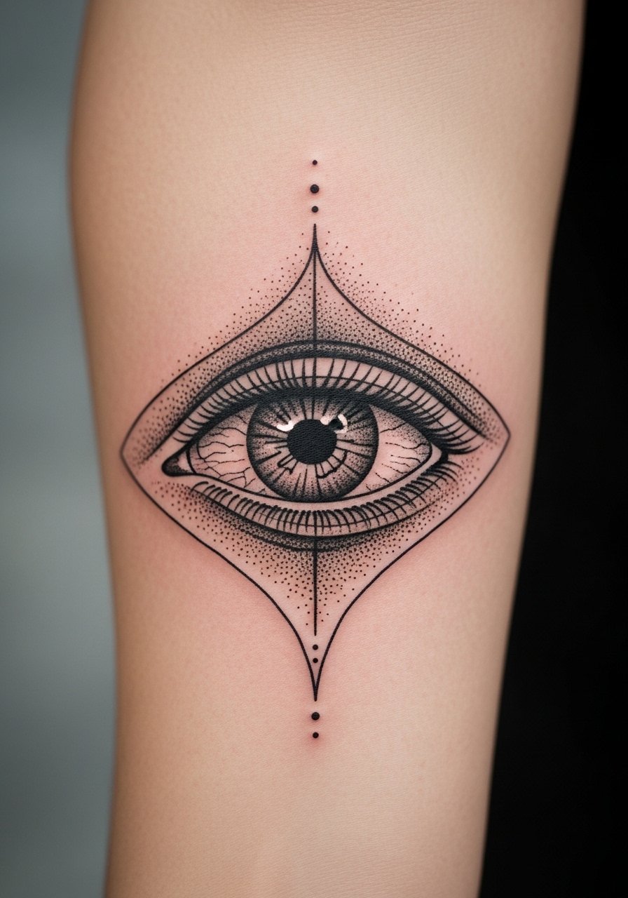 This forearm placement reads like a modern talisman—an eye with palmistry lines and small surreal elements. Forearms hold ink well and are visible without being extreme. Pain is moderate. Dotwork tends to soften, but when balanced with strong lines it retains texture. Avoid too-dense dotfields that can look muddy when healed. Ask an artist experienced in esoteric symbolism to maintain readability.