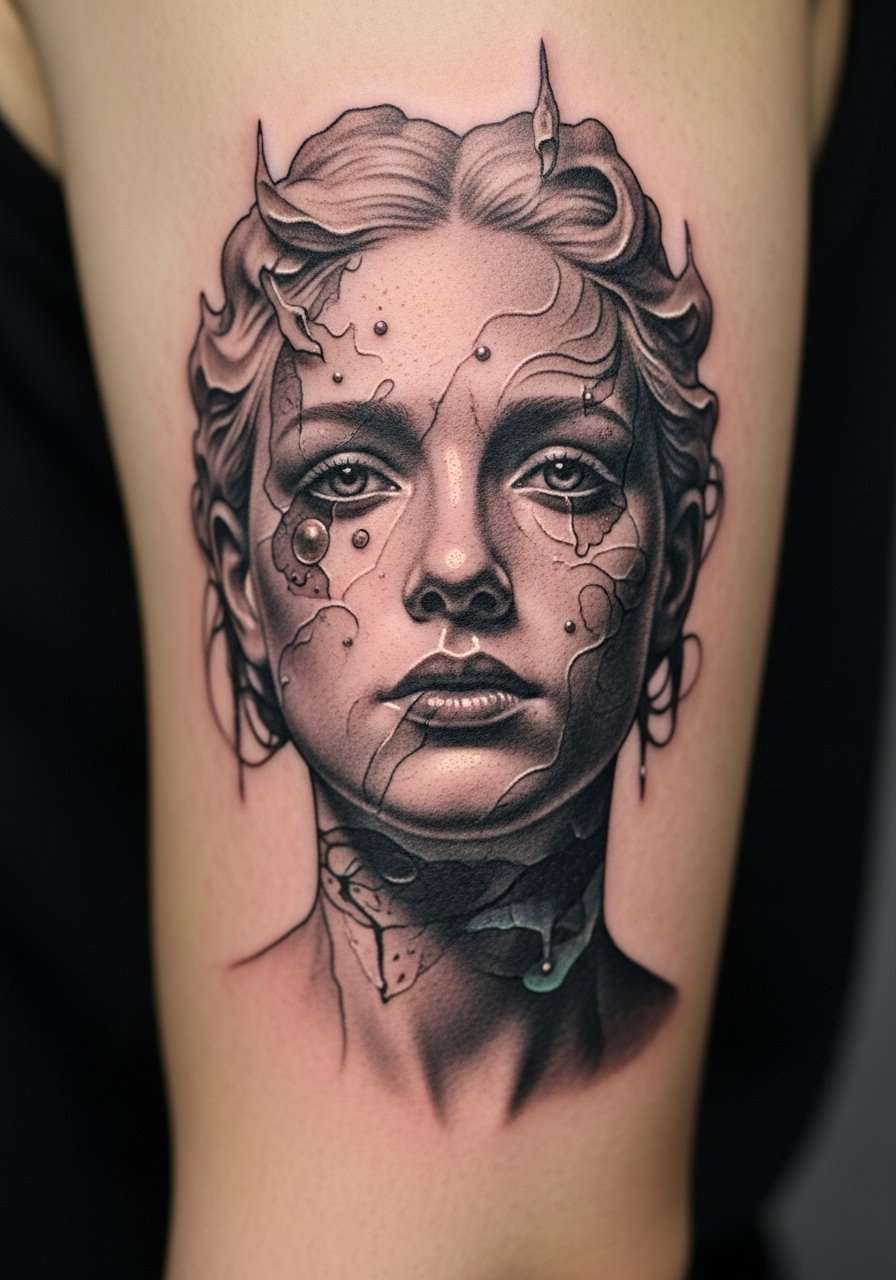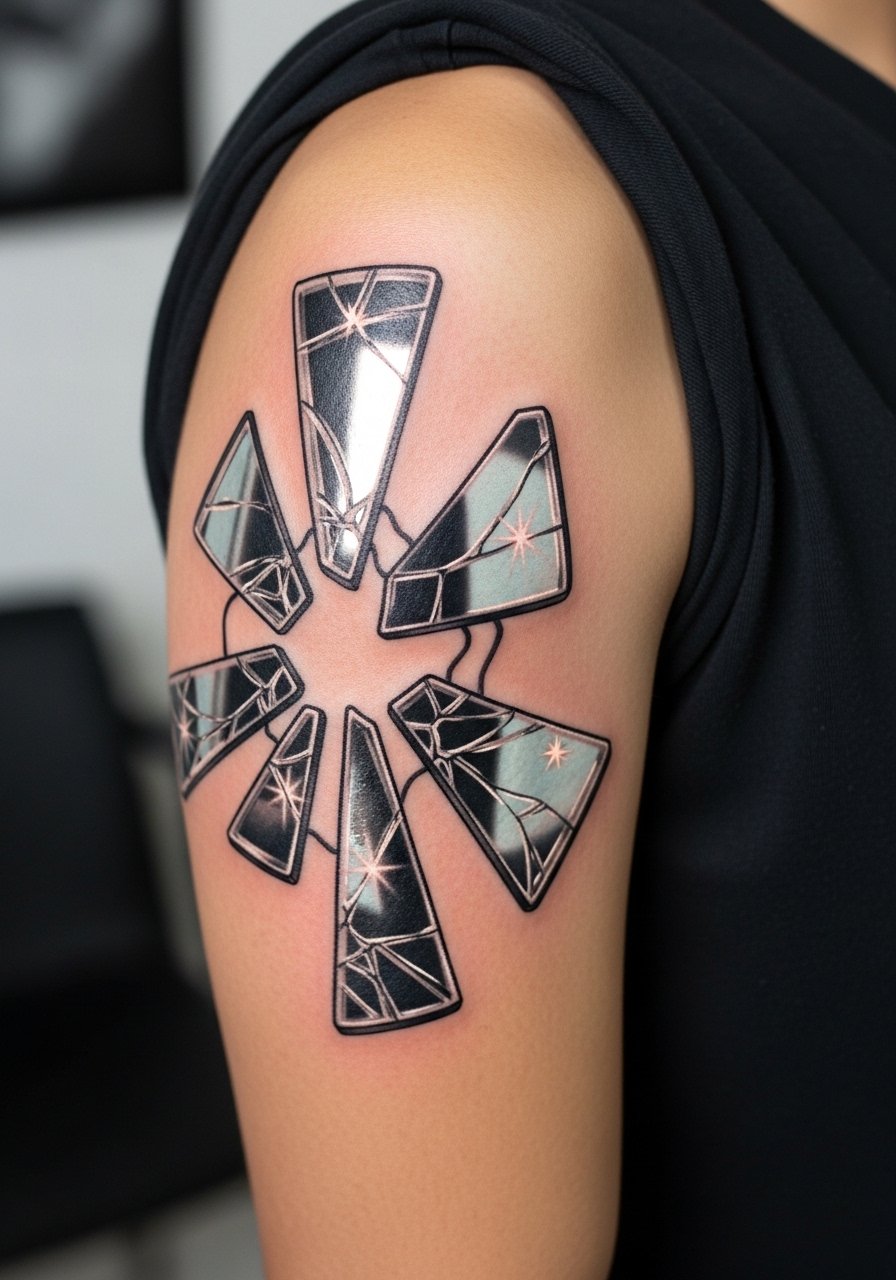 I saw a mirror shard piece that read like a past self. The upper arm is friendly for larger shard pieces. Pain is low. Sessions 1-2 hours. Tell the artist you want distinct highlights that will remain visible after healing. The common mistake is relying on tiny white lines. Those vanish. At six months most highlights mellow. At two years highlights may need restoration. Pick an artist who knows how to balance white with surrounding tone for long-term readability.