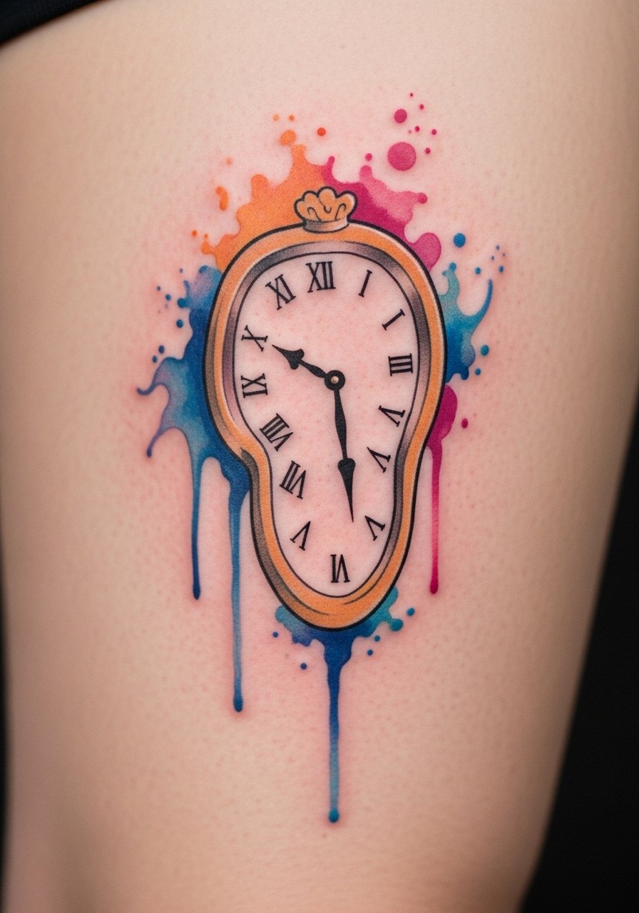 4. Watercolor Melting Clock on Outer Thigh