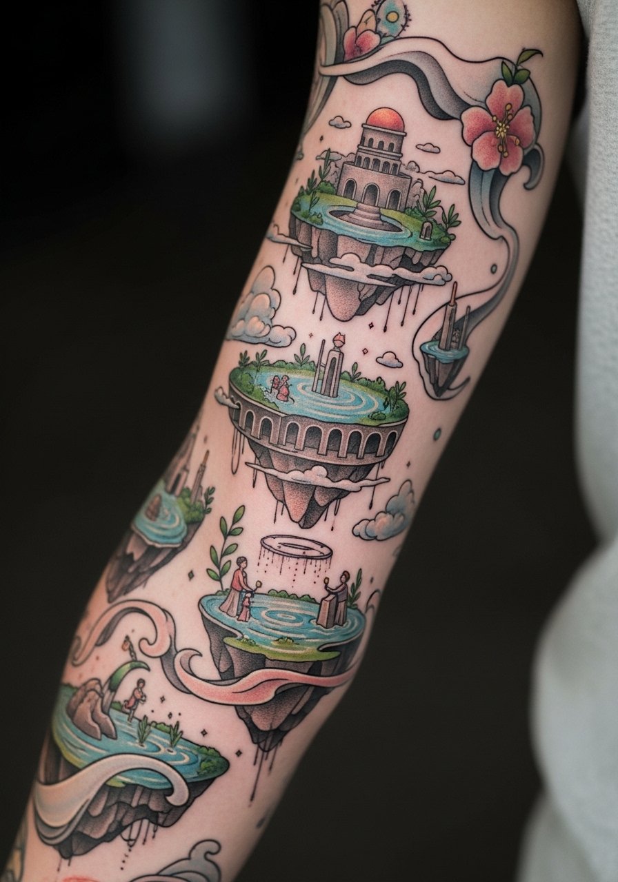 When I saw a sleeve like this in a shop window, I realized surreal elements read best when they flow. A sleeve requires several sessions across months. Expect variable pain depending on areas. Tell your artist about the narrative you want, and ask for composition sketches. People often try to cram too many small elements. That creates visual clutter and speeds fading. At six months the sleeve will start to look cohesive. At two years expect some lines to soften across the bicep. Plan for touch-up sessions. Artists who can map negative space and use varied contrast are key for this.