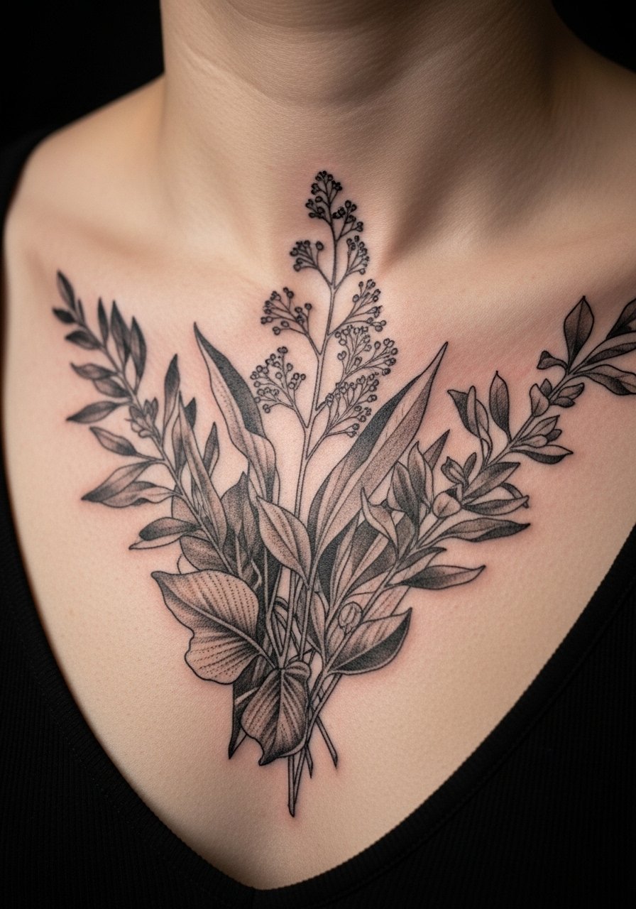 I discovered this style at a convention booth. The sternum gives a centered, intimate look. Pain is high on the sternum. Sessions usually 1-3 hours. During consultation say you want clear separations between layers so the double exposure effect survives healing. A common mistake is too much fine cross-hatching in overlapping areas. That blurs into noise. At six months the layered elements start to blend slightly. At two years contrast loss can hide details, so plan for bolder midtones. Artists who map value rather than tiny detail will produce a longer-lasting effect.