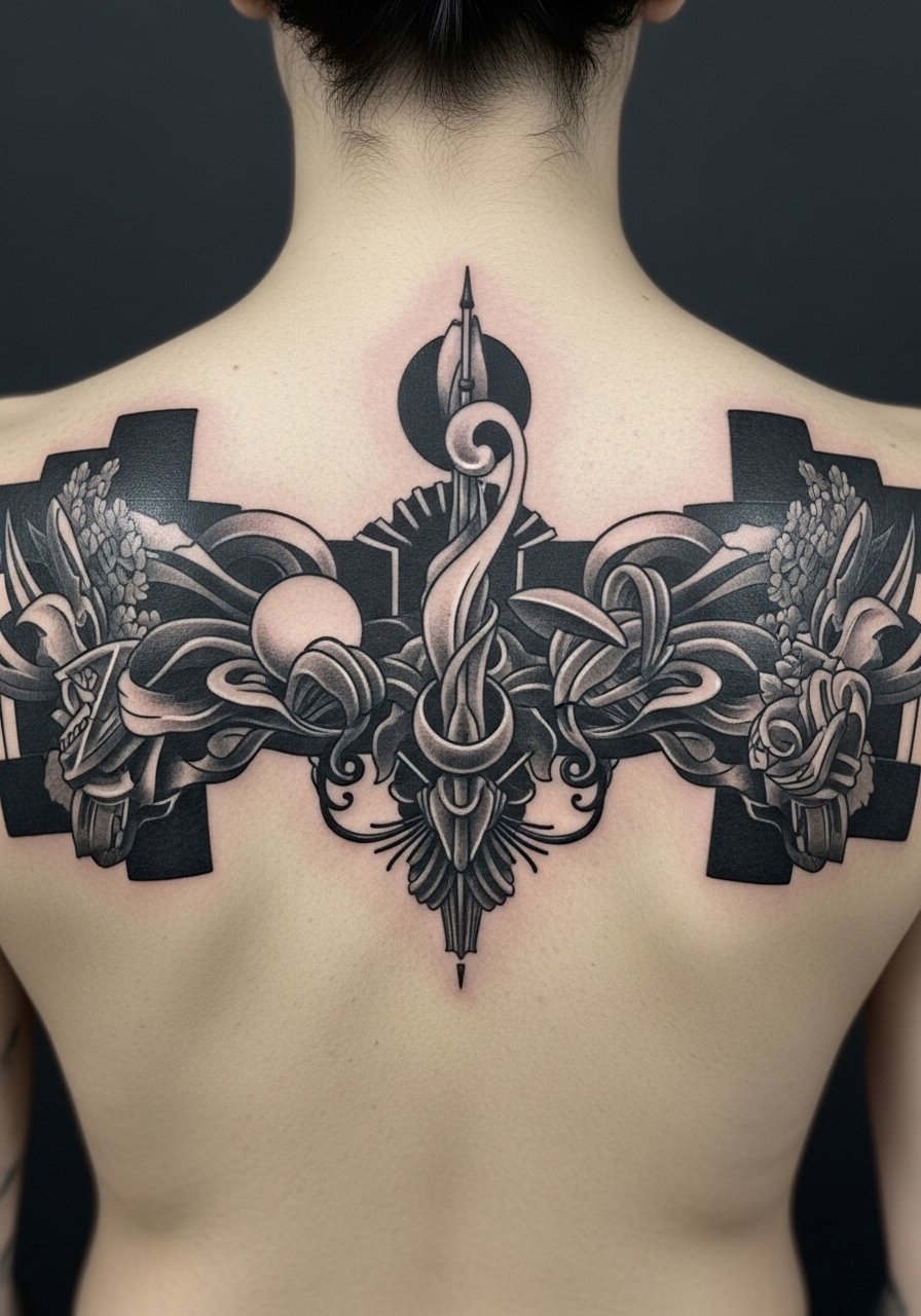 The upper back is a forgiving canvas. I recommend blackwork for surreal collages because the strong contrast keeps forms readable. Pain is low to moderate. Sessions can be long. Tell your artist you need clear breathing room between motifs. I see collages fail when elements are crammed. At six months the blacks look uniform. At two years smaller interior lines inside solid blacks may have softened. Ask for bold separations and consider adding subtle color highlights if you want variety. This placement works great if you plan future extensions.