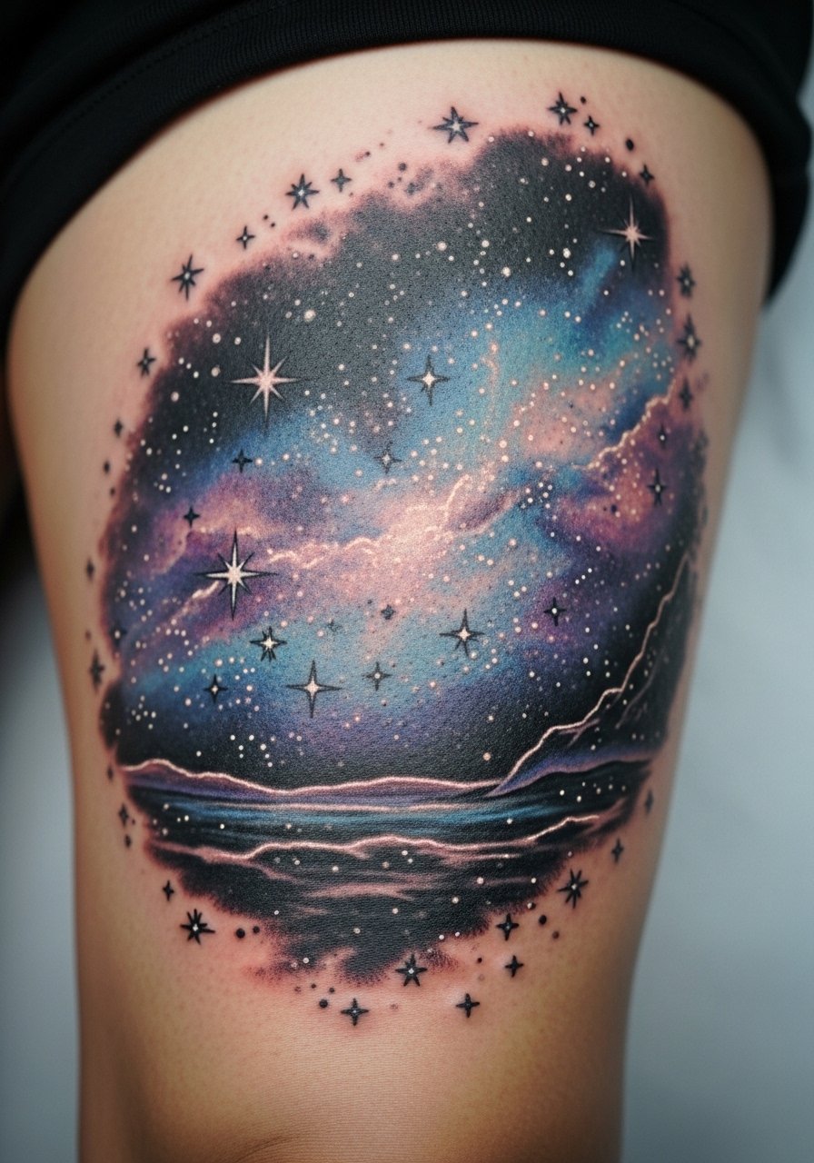 The thigh is one of my favorite spots for dreamy astral pieces. The canvas is large and low-friction. Pain is low. Sessions run 1-3 hours. Ask your artist to lock in bright white highlights and crisp black stars. A common mistake is relying on pale white highlights only. Those disappear. At six months gradients become softer. At two years small white dots may need touch-ups. Artists who layer pigments thoughtfully can keep stars popping for years. Thigh versions age better than hip or lower leg ones.