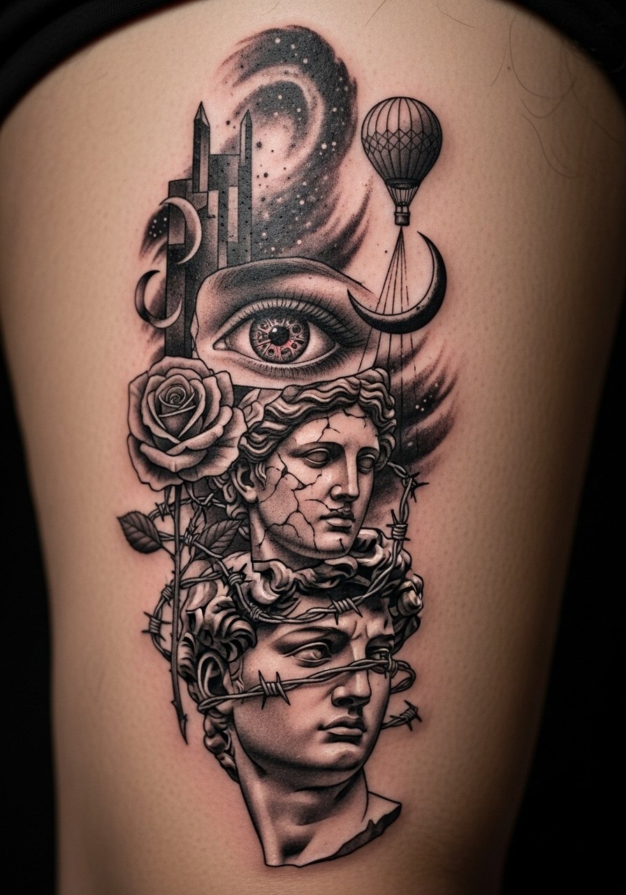 This list focuses on surreal tattoos that mix fine line, micro-realism, and blackwork. Most designs work well on forearms, ribs, thighs, and calves. From what I’ve seen, artists in 2026 are pushing layered surrealism with negative space and muted color palettes, the styles that tend to age cleaner.