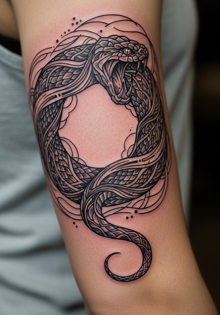 When I saw an ouroboros wrap, it read like motion. The outer bicep heals well and tolerates wrap patterns. Pain is low. Sessions 1-2 hours. During consultation, ask for even line thickness across the wrap. A common mistake is inconsistent line weight causing visual wobble when flexed. At six months the oval shape settles. At two years minor spreads can alter perfect symmetry. Request measured linework and preview on an arm mock-up. This design looks great with subtle ornamental details that age better than tiny scales.