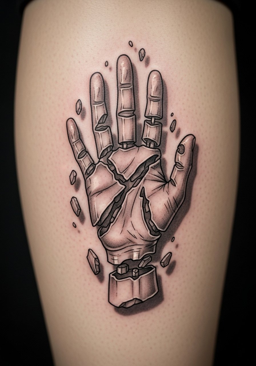 I love hands in surreal work because they read as gestures in motion. The calf offers a stable healing surface. Pain is moderate. Sessions 1-2 hours. Ask your artist to plan where gaps will be larger, to avoid tiny negative spaces that close up. A mistake is asking for too many little cuts between segments. At six months gaps may look narrower. At two years tiny separations can look merged. Artists who sketch with intentional negative space will preserve the fragmentation effect.