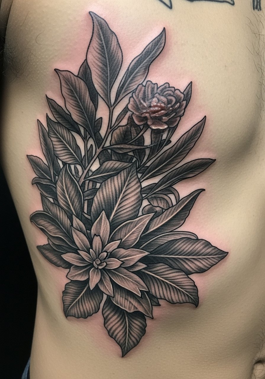 23. Surreal Botanical Cover-Up on Ribcage