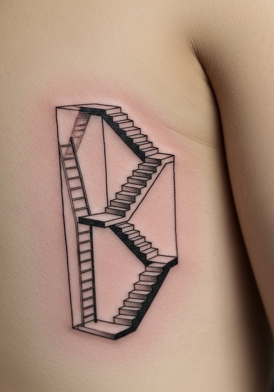 I was drawn to a tiny staircase that suggested an escape. The side rib is painful but poetic. Sessions are short to moderate. Ask your artist for firm shadow anchors under steps so perspective survives healing. A mistake is making stairs with only hairline steps. They blur into wash. At six months the perspective still reads. At two years, thin structural lines may need refresh. This version works if you want a small symbolic piece with a narrative feel.