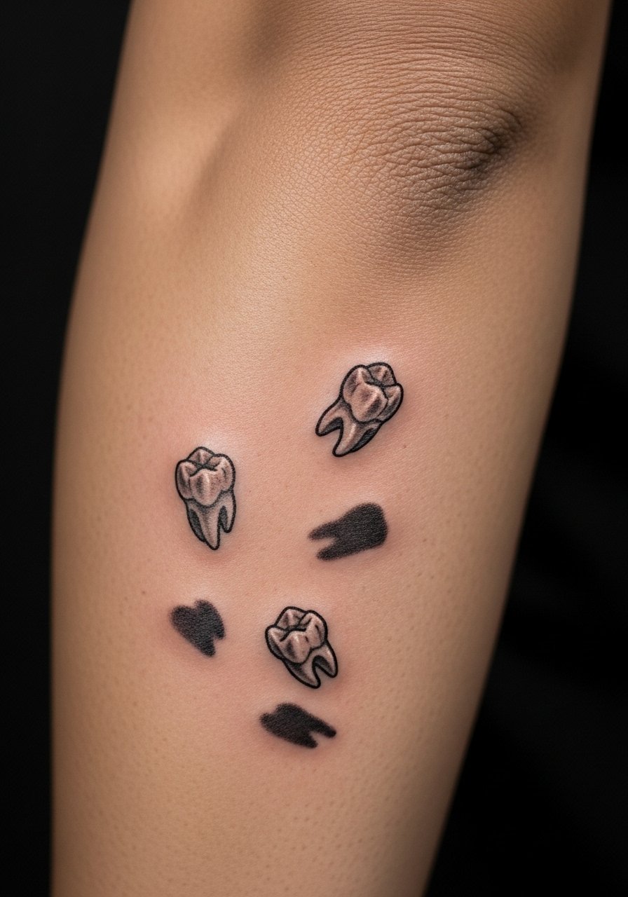 The floating teeth idea felt strange and oddly poetic when I first saw it. The lower arm gives good visibility and predictable healing. Pain is low. Sessions are under two hours. Ask your artist to keep tooth outlines slightly bolder than you think, especially around roots. I see tiny dental details blur into grayness after a year. At six months the teeth appear dimensional. At two years tiny cracks between teeth can close up. If you want the eerie floating effect to last, plan for modest line weight and strategic shadowing.