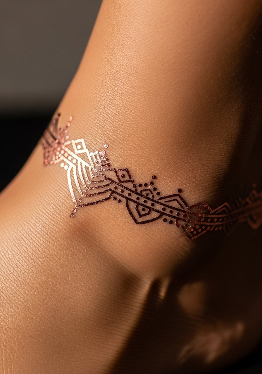 Metallic tattoos are great for holiday looks and read like jewelry from a distance. Foil transfers with semi-matte finish look less costume-y and more like delicate metalwork. The ankle is a classic jewelry spot; the thin strip mimics chain links well. These are more about surface shine than depth, so expect shorter wear if you’re active. For realism, choose thin-link patterns and duller gold tones—too bright a foil can scream temporary.