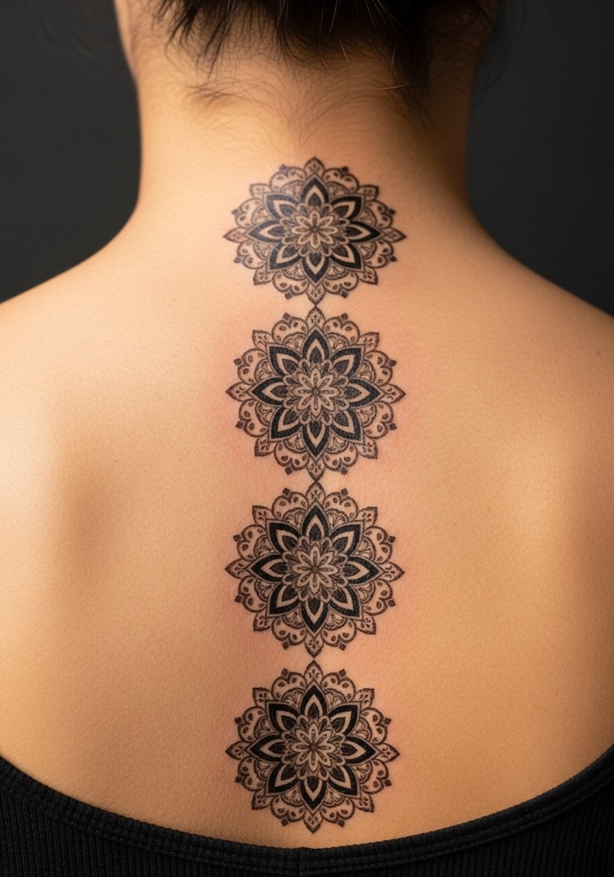 A thigh band mandala gives you a preview of a decorative band tattoo’s scale and symmetry. Because the thigh holds detail well, transfers look very convincing here. Be cautious about overly dense dotwork; the band should breathe with negative space. This is also a great spot to test whether you want a bold or delicate band permanently.