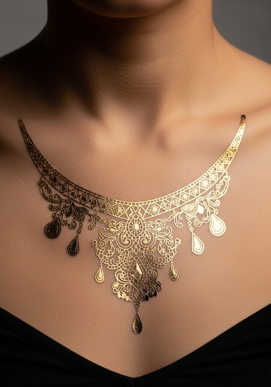 Foil statement tattoos photograph beautifully and can stand in for heavy jewelry in shoots. For a believable look, pick subdued metallic tones and thin links. These sit best on chest or clavicle where they mimic necklace placement. They won’t last as long as matte transfers, but the visual effect is immediate and convincing from a distance.