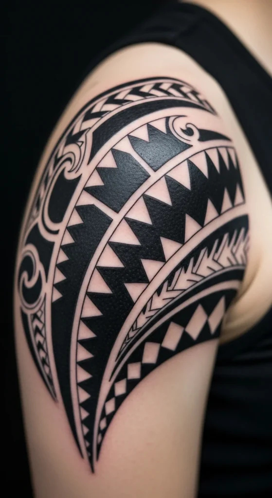 Shark teeth appear in many Polynesian traditions. They stand for strength and protection. The shapes repeat in neat rows, so the design flows well on shoulders and forearms. If you’re planning something small, start with a short band. It’s simple to map out with a black marker before committing. You can also print a shark-tooth stencil and hold it against your arm to see how the spacing feels. This is cheap, quick, and helps you avoid awkward gaps. Many artists like these patterns because they’re clean and easy to shape around curves. If you want a fuller look later, you can add waves or triangles beside the original band. Building the design step-by-step keeps the cost low and lets you learn what fits your body. Keep the lines bold. Thin lines fade faster. Ask the artist about thicker ink passes if you want a long-lasting finish. This is a great starter idea for anyone who wants cultural depth without a massive project.