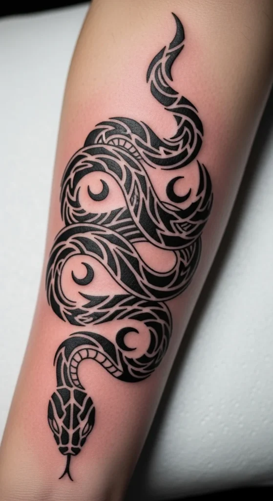 A snake naturally forms a long curved shape, which pairs well with tribal lines. Wrap it around the forearm or calf for a smooth flow. Start with the outline of the snake. Break the body into small panels of triangles or waves. If you want a smart planning trick, print a simple snake outline and cut it into strips. Place the strips around your arm to check the curve. This keeps the design controlled and low cost. Keep the head clear of details so the pattern doesn’t get lost. If you want gradual upgrades later, add background lines or dots behind the snake.