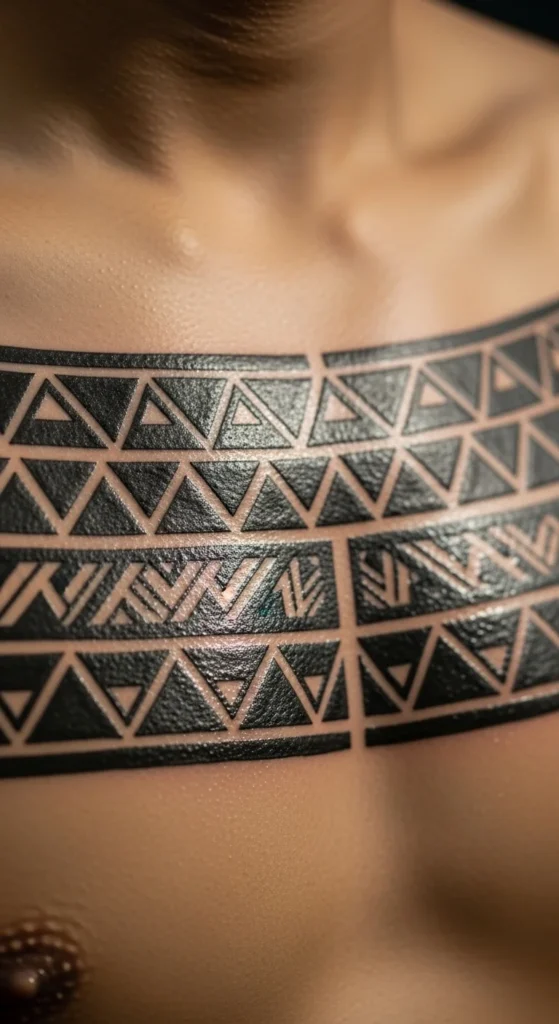 Filipino Batok designs often use thick blocks and step-like patterns. A chest band works well for these shapes. Start with one horizontal row. This keeps the session short and wallet-friendly. If you want to test ideas, draw a straight line across your chest with a washable marker, then tape small triangle pieces along it. Move them until they look natural. Pick a width that matches your comfort. Chest skin can be sensitive, so simple patterns reduce session time. If you want future expansion, add a second row below the first. Keep the shapes bold. Thin lines fade and require extra work.