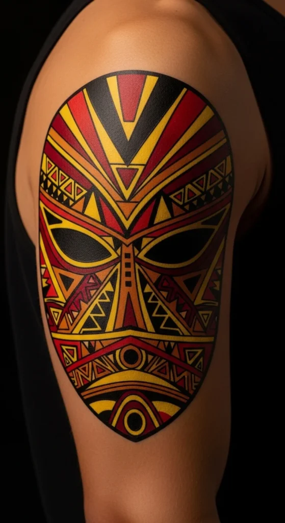 African mask forms carry cultural depth and shaped patterns. To avoid cultural distancing issues, keep these designs on arms, backs, or legs—not the face. Start with a mask-like outline. Fill it with triangles, rectangles, and bold arcs. If you want a simple test, draw half the mask on paper, fold, and trace it to make symmetry. This concept works nicely for shoulder or thigh areas. Keep the shape strong with thick lines. Avoid too many tiny details. If you want to stretch the design later, add lines around the mask to form a halo-like frame.