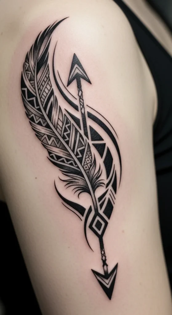 Feathers and arrows appear in many Native American traditions. To keep the design respectful, lean toward geometric interpretations rather than copying specific tribe symbols. Draw a feather using straight edges instead of realistic curves. Add a small arrow shape under or above it. This style fits the forearm or calf well. To preview cheaply, cut a feather shape from black paper and tape it on your arm. Adjust size until it feels right. Keep the ink thick and avoid tiny shading lines. A minimal, bold layout reduces cost and keeps the shape readable over time.