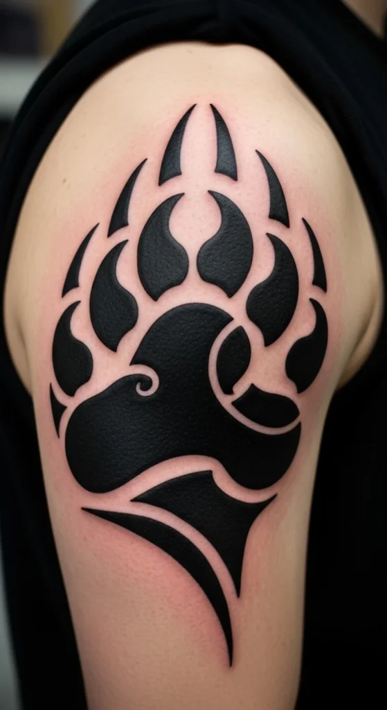 A bear paw has simple shapes that adapt well to tribal linework. Start with the outer paw shape. Add thick curves for the toes. Inside the paw, add small block shapes or triangles. The design works well for the shoulder or outer thigh. You can test the spacing by drawing the paw on sticker paper and placing it on your skin. A simple layout reduces session time, keeping costs low. If you want extra meaning, add small dots or short lines inside each toe. These small touches help personalize the piece without extra spending.